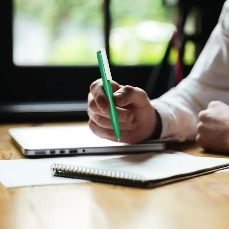 Bolígrafo plástico de cuerpo de color sólido y clip en color blanco. Apertura con pulsador. Tinta Negra 1000 m de longitud de escritura. Zecat