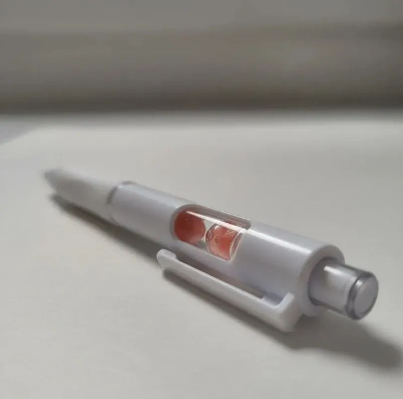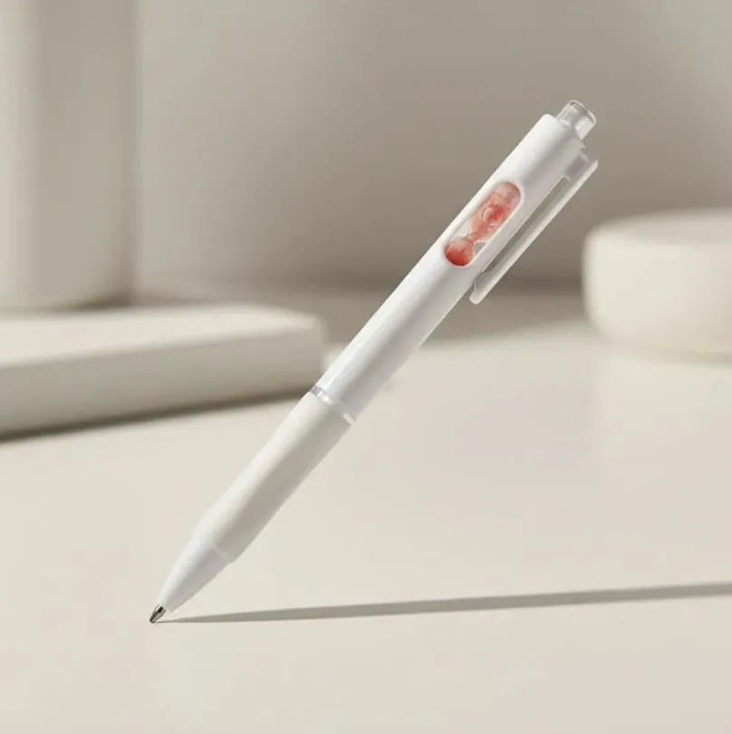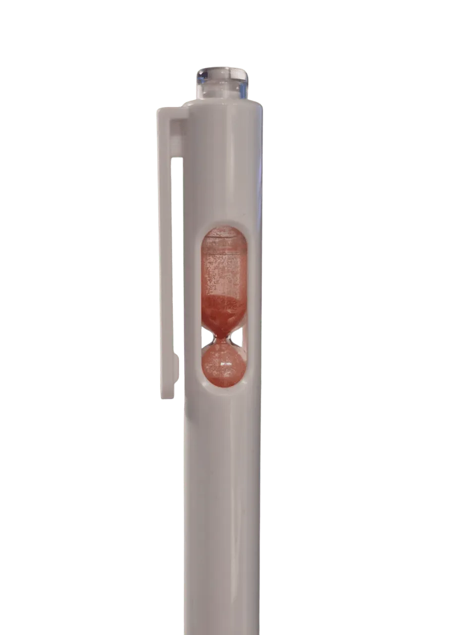 Bolígrafo retráctil con un pequeño reloj de arena en el interior. Cuerpo blanco, grip de goma, clip cristal y arena en varios colores.