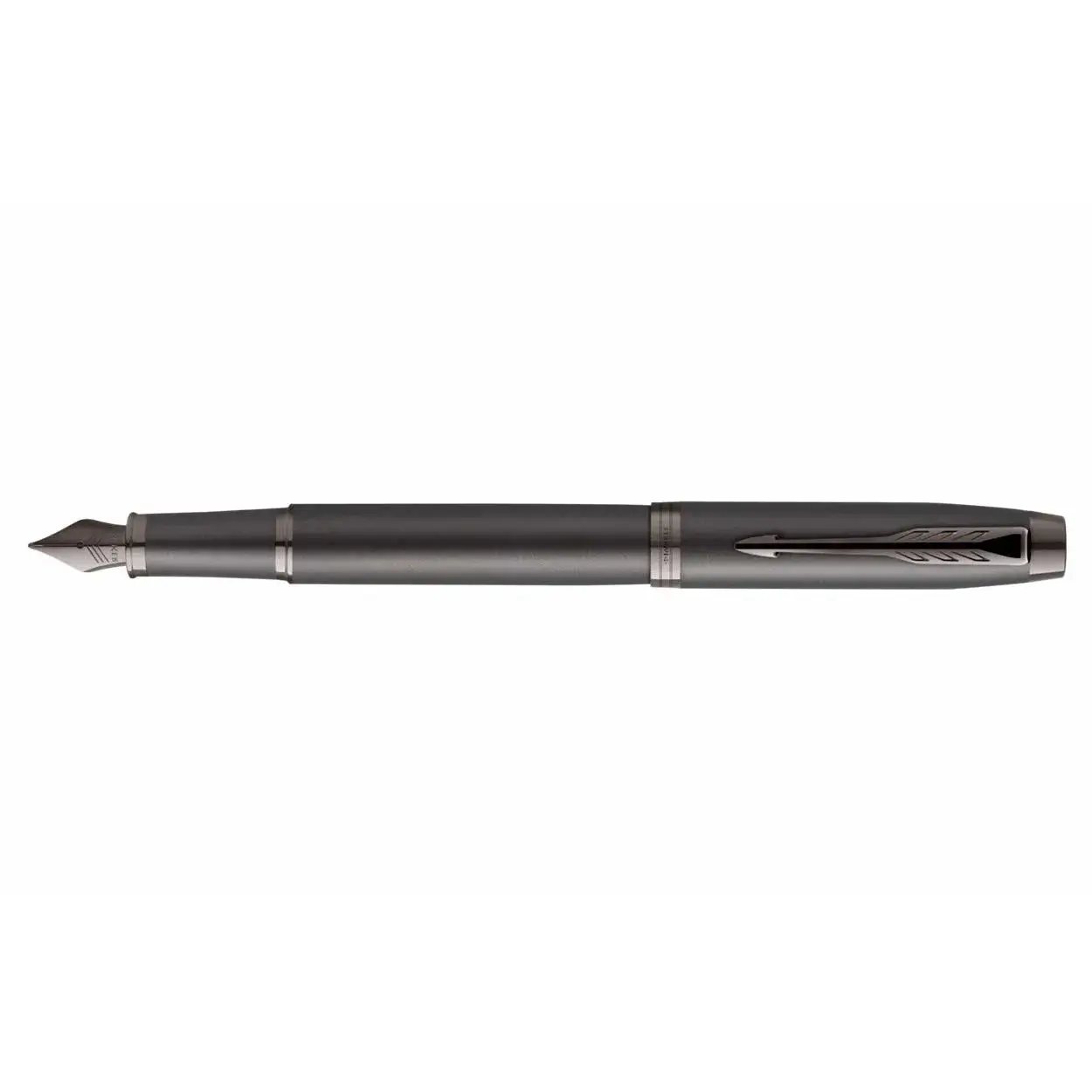 Pluma fuente de punta media, con cuerpo de acero inoxidable y diseño elegante completamente monocromático. Tinta Azul.