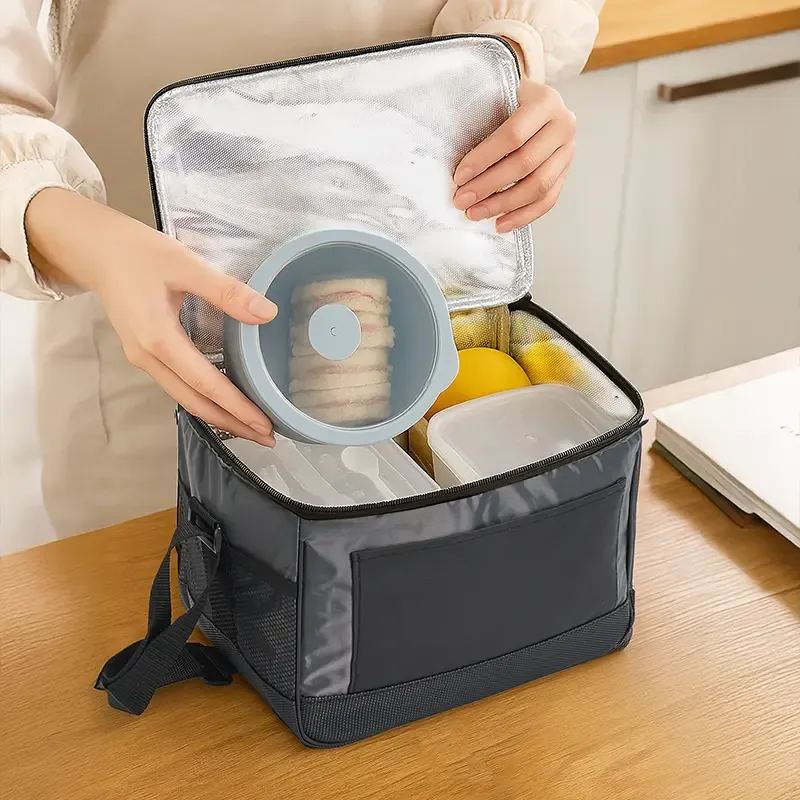 Cooler rectangular con correa regulable y cierre superior. Está confeccionado en tela 70D con interior de aluminio y espuma PE. Cuenta con compartimiento principal con cierre, bolsillo frontal y correa larga ajustable. Incluye interior térmico y base reforzada.
