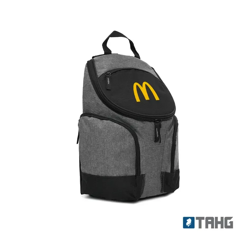 Cooler confeccionado en tela Nylon 600D, interior térmico forrado en PVC gris. Bolsillos laterales. Apto para llevar botellas, termos y otros. Colores: Negro, Blanco, Azul y Rojo. Medidas: 28 alto x 20 ancho x 14 base cm. Capacidad: 8 Lts.