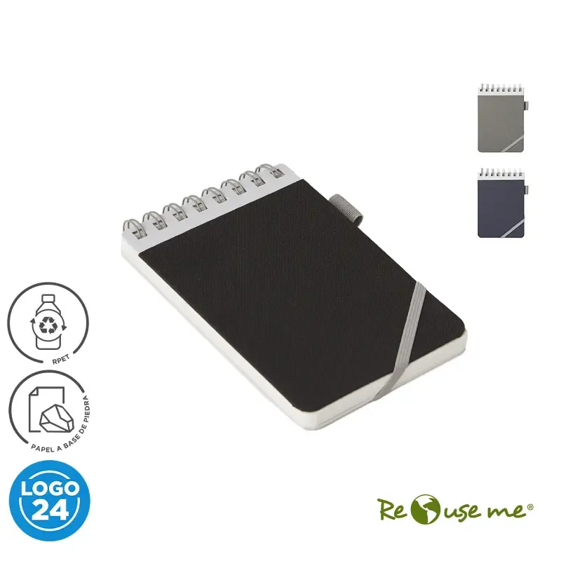 Cuaderno anillado con tapa confeccionado con tela fabricada a partir de RPET, hecho con botellas de plástico reciclado. Con hojas 64 lisas de Papel de 144 gramos a base de piedra, de escritura suave, más duradero y resistente que el papel tradicional. Para realizar este papel no se han talado árboles, ya que está confeccionado a partir de Polietileno y polvo de piedras. Cuenta con un cierre elástico y una etiqueta. Medidas: 11 x 15 cm. Se presenta protegido en bolsa. ReUseMe.