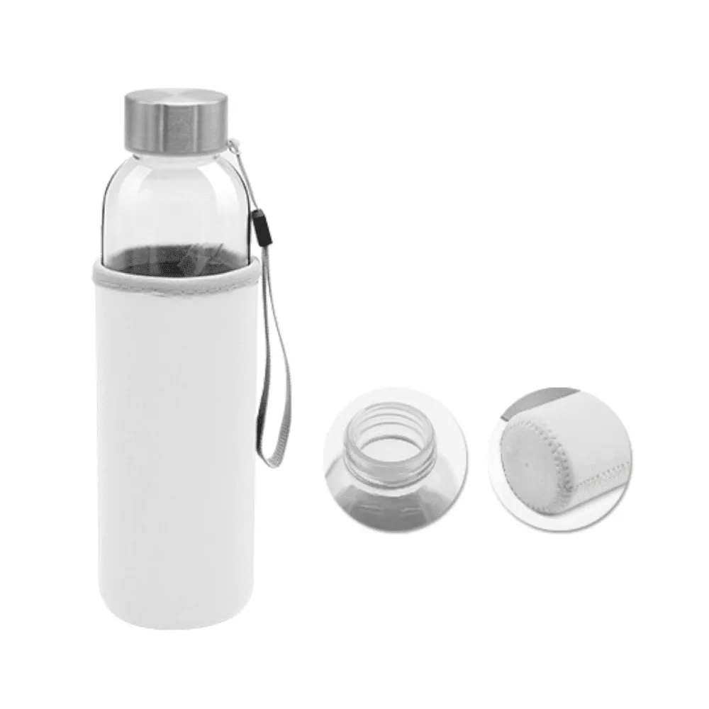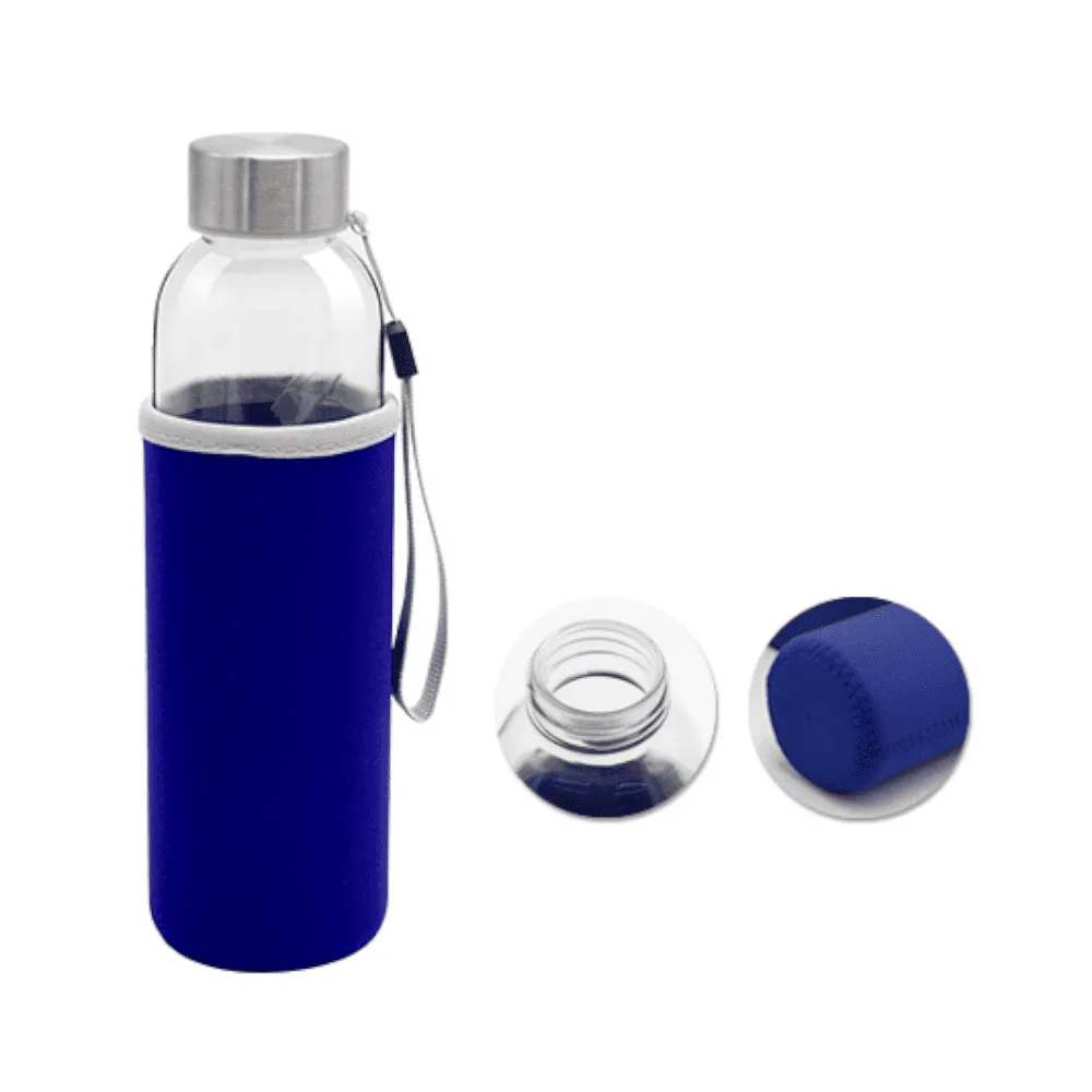 Botella de vidrio con funda de neopreno. Con tapón de seguridad de rosca de acero inoxidable y correa de transporte en la parte superior.