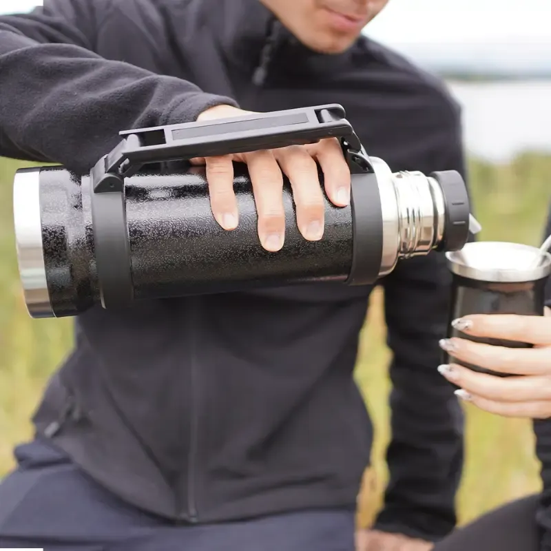 Termo de acero inoxidable 304, recubierto con esmalte especial que protege de ralladuras y golpes. Puede mantener el contenido a la misma temperatura durante 18hs, gracias a su doble pared aislante especial de acero. Cuenta con un tapón cebador Hermético a rosca con la función anti derrame y tapa con superficie plana estable para usar como taza o vaso y manija plegable para facilitar el transporte. Presentado en caja de cartón. Producto aprobado por el I.N.A.L. para el contacto con alimentos. Medidas del termo: 34 cm x 10,5 cm. Medidas de la caja: 35 x 11 x 11 cm. Capacidad: 1,1 Lts. Pampero.