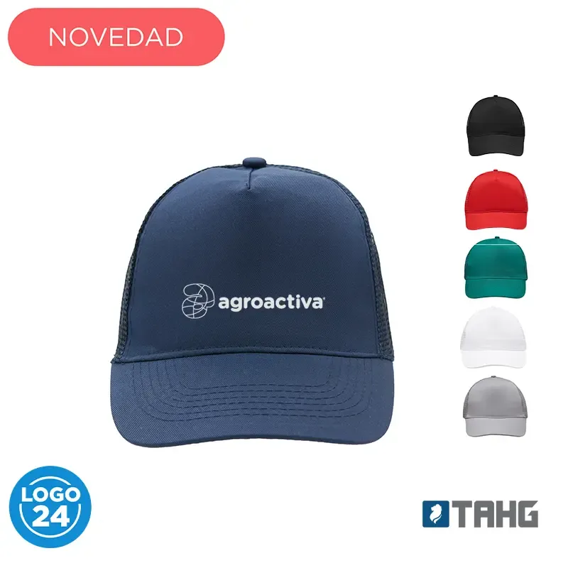 Gorro de 5 paneles en Polyester. Parte trasera con tela red. Diámetro 56 cm. Ajuste con broche plástico. Tahg.
