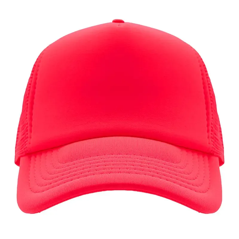 Gorro de 5 paneles en poliéster con parte trasera de tela de red. Disponible en colores fluorescentes: rosa, verde, amarillo, naranja y combinaciones de estos con blanco. Ajuste con broche plástico.
