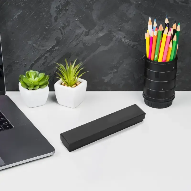 Caja individual para bolígrafos, ideal para presentar tu regalo de manera sofisticada y profesional. Diseñada en papel color negro y un tamaño de 16,3 x 3 x 2 cm, es compatible con la mayoría de las lapiceras estándar. Ligera y resistente, es excelente para aumentar el valor percibido del regalo.