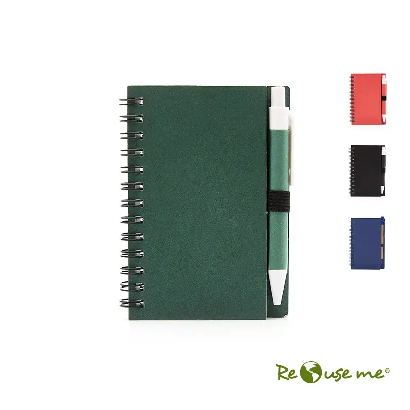 Cuaderno anillado colors tamaño A6 con 50 hojas lisas de 80 grm. Realizado con tapa dura elaborada en cartón reciclado. Incluye bolígrafo con pulsador. Medidas: 8 x 12 cm. ReUseMe.