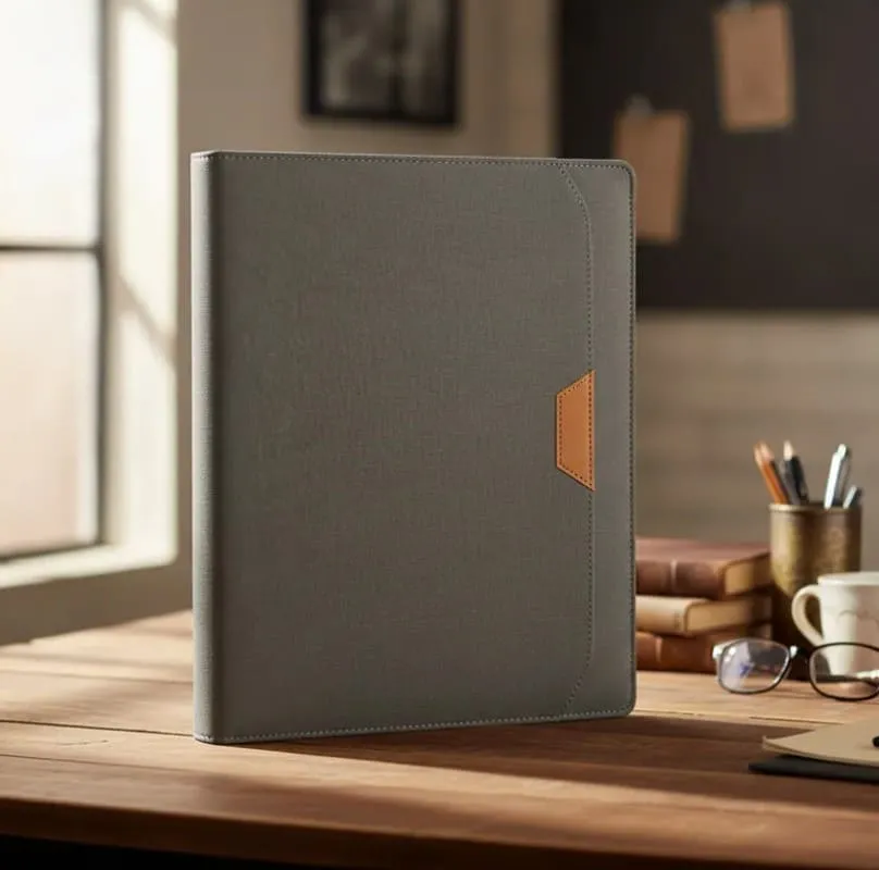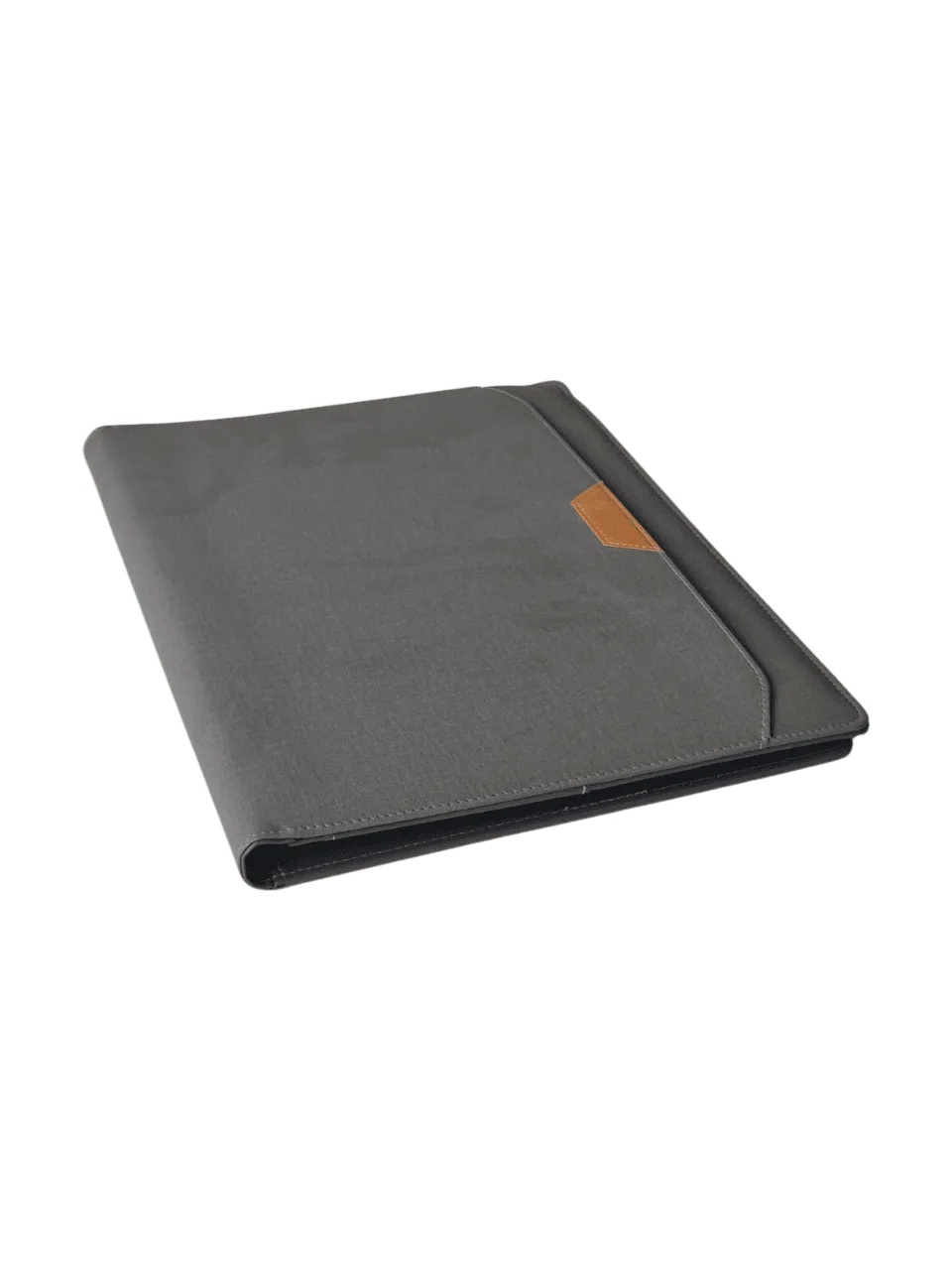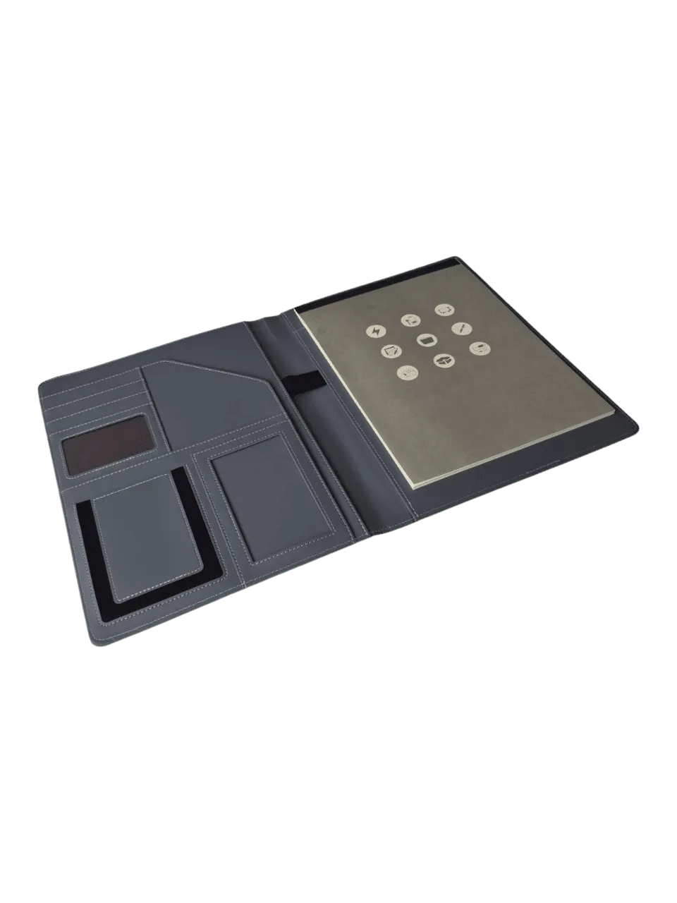 Protfolio en PU simil gabardina. Frente con un bolsillo con detalle en simil cuero. En su interior, solapa para papeles, y sobre ella diversos porta tarjetas, bolsillo principal y dos al frente (uno elastizado). Porta bolígrafo central y block de 30 hojas rayadas.