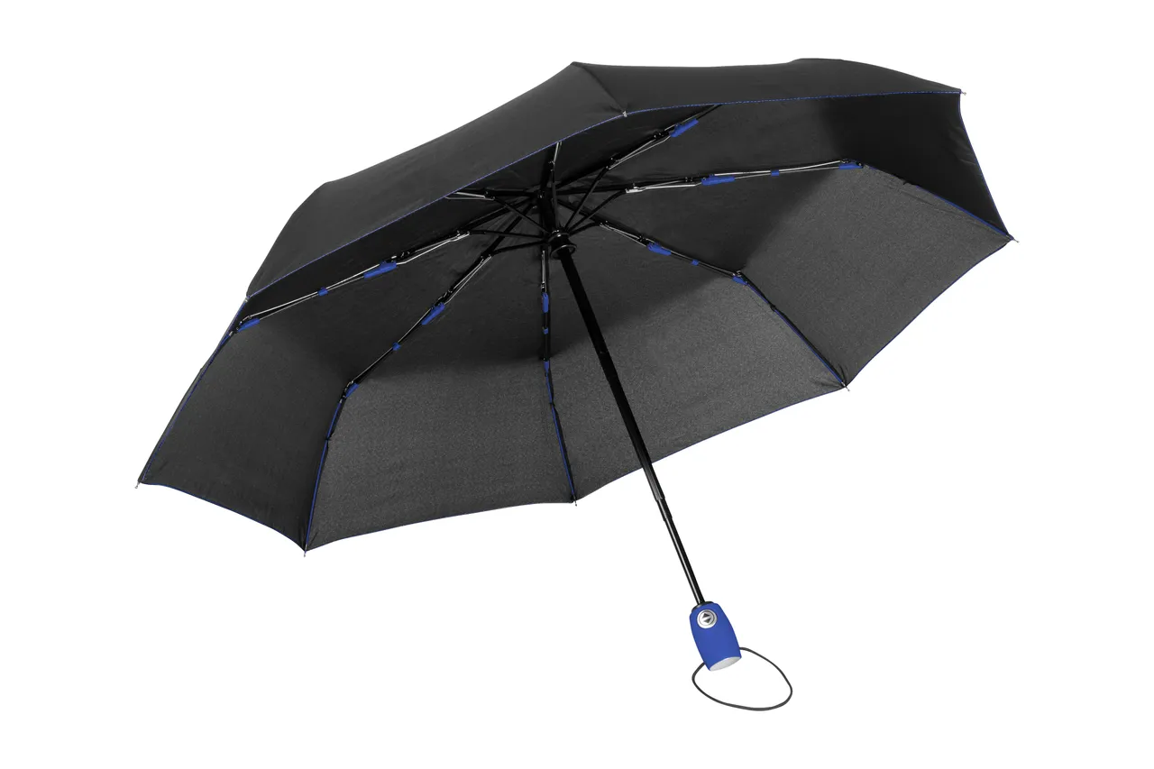 Ø 98 cm. 8 gajos. Ancho gajo 37 cm. Largo cerrado 27 cm. Largo abierto 54 cm. Poliéster, metal y plástico engomado. Paraguas APERTURA Y CIERRE AUTOMÁTICO con sistema antiviento. Eje metálico y varillas de fibra de vidrio con detalles en color. Mango plástico engomado de color con cordón elástico color negro. Botón a presión. Cubierta y funda de poliéster con costura de color. Cierre con correa de velcro.