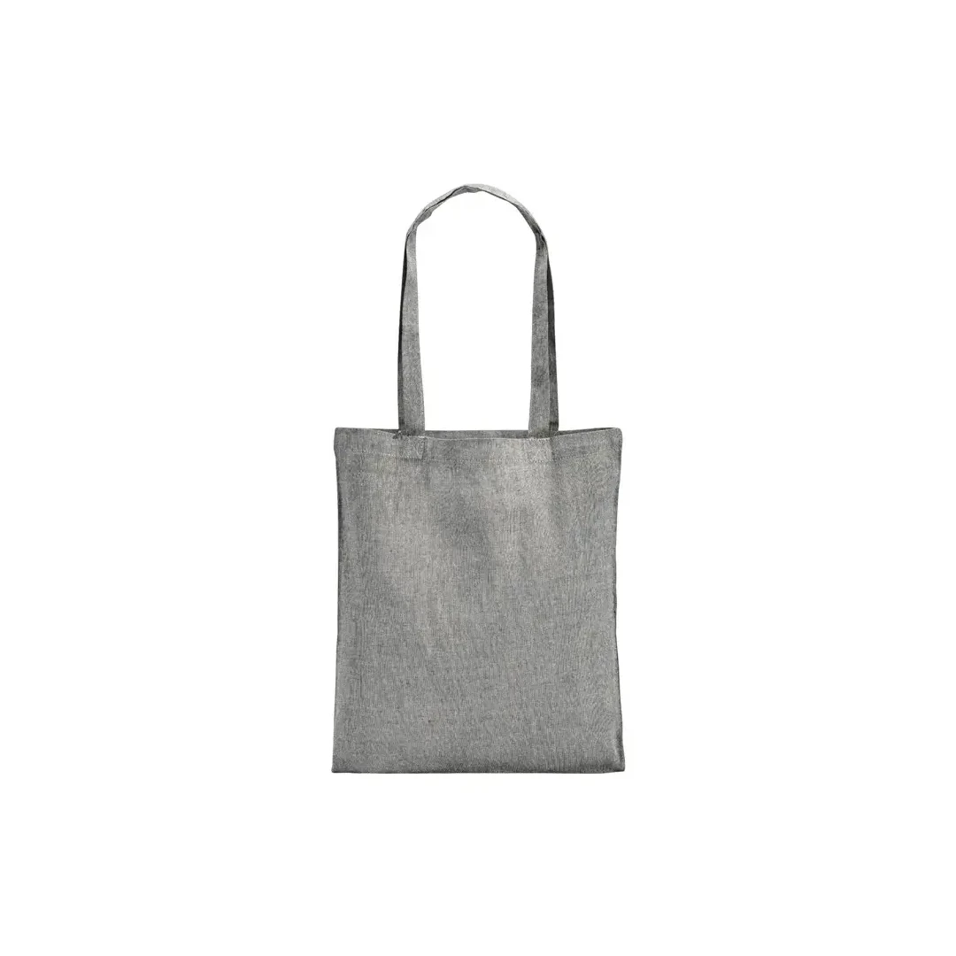 Bolsa fabricada con materiales reciclados: 70% algodón reciclado y 30% poliéster reciclado (rPET), con un gramaje de 140 g/m². Cuenta con asas de 60 cm de largo. El algodón reciclado conserva su color natural, ya que no se somete a procesos de teñido ni blanqueo, lo que reduce el uso de productos químicos y el impacto ambiental.